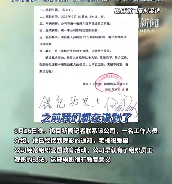 观影时间就定在2025年9月18日上午,而且公司想得那叫一个周到,不仅统一安排大巴车接送员工前往影院,员工观影产生的相关费用也给予报销。通知里还特别提到,希望大家能通过这次活动以史为鉴,珍惜当下,喊出了 "山河已无恙,真相不能忘,吾辈当自强" 的响亮口号。