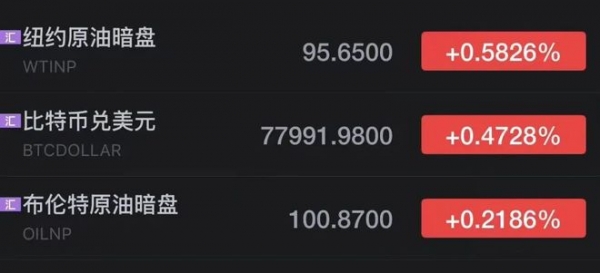 北京时间4月25日深夜,原油暗盘突然直线拉升,比特币跳水。截至26日13:58左右,布伦特原油暗盘报100.87美元/桶,纽约原油暗盘报95.65美元/桶。加密货币方面,比特币翻红,报77991.98美元/枚,根据CoinGlass数据统计,过去24小时,加密货币全市场超8.4万人爆仓。