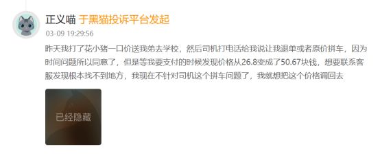 其一,"一口价"名存实亡,实际价格大幅溢价。大量消费者反馈,花小猪宣传的"一口价"服务形同虚设,实际支付金额远超预估价格。有消费者举例称,选择一口价服务后,司机以各种理由要求按原价拼车,乘客同意后,支付金额竟从最初的26.8元暴涨至50.67元,溢价近一倍,严重侵犯了消费者的知情权与公平交易权。