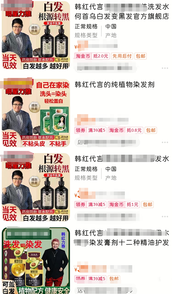 而在网络上搜索就会发现,不少无良商家确实将她的头像通过PS手段放到了商品简介头图页面,并欺骗性地标注了"韩红代言",以此吸引消费者了解和购买。