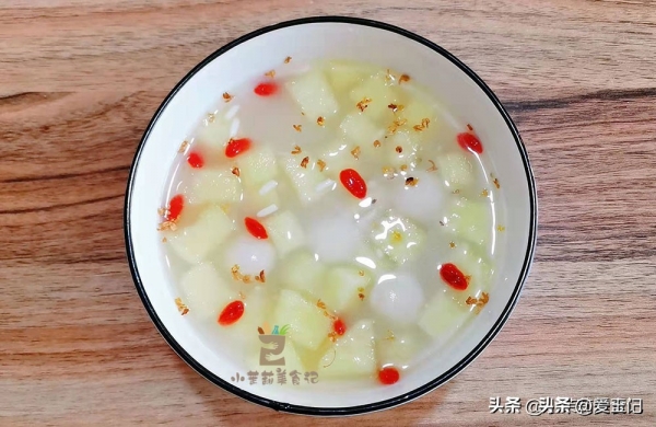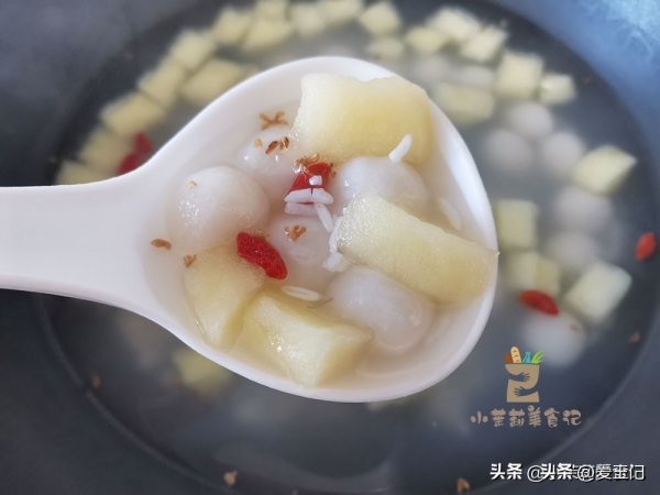 3、在锅里添上水,放苹果一起煮到沸腾,圆子撒进去,搅拌汤汁令其飘起来,煮三五分钟,熟透后撒些枸杞,桂花,两勺米酒搅匀后马上关火。