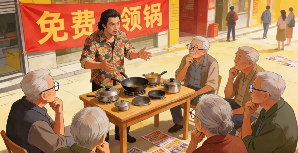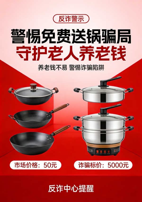 其一,以"免费领取""零元赠送"为诱饵,赠送锅具、粮油、保健品等物品,却要求先交钱、押款或转账,本质都是骗局。老人偏爱实惠、容易心软,骗子便利用贪小便宜的心理设下圈套。