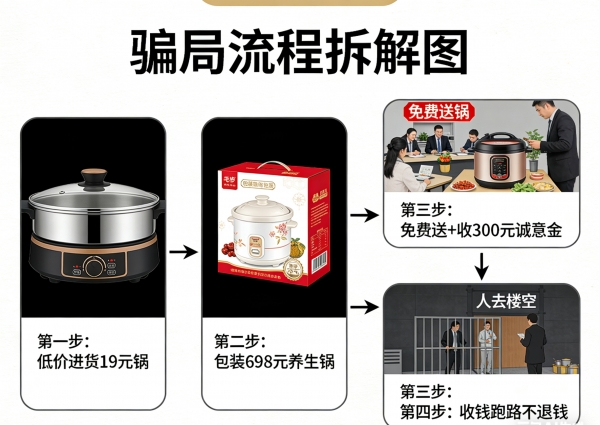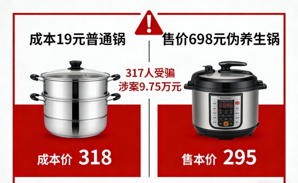 这起骗局的作案手段并不复杂,却精准拿捏了老年人的心理。三名年轻人从网络平台低价采购厨具,普通锅具单口成本仅19元,菜刀一套成本32元,都是市面上最常见的普通产品。经过他们包装后,这些廉价厨具摇身一变,成为标价698元、具备养生功效的"高科技产品",专门在乡村、社区忽悠老年群体。