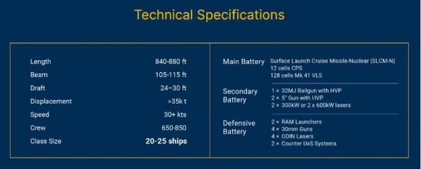 根据美国海军公布的数据,"特朗普"级战列舰将取代美国海军的下一代DDG(X)驱逐舰项目,并在很大程度上采用后者的成熟设备。与DDG(X)一样, "无畏"号也将采用综合电力系统,依靠燃气轮机和柴油发动机驱动发电机,为舰上的武器系统和传感器供电,并保证该舰航速超过 30 节。这种新型战列舰将采用"阿利·伯克"级Flight III 型导弹驱逐舰上使用的成熟作战系统和武器,配备AN/SPY-6有源相控阵雷达、128单元MK-41垂直发射系统、12枚"常规快速打击"远程高超音速导弹以及5英寸舰炮。美国海军数据显示,该舰还预留了加装其他武器的空间,包括定向能武器、核弹头海基巡航导弹以及可能的32兆焦耳电磁轨道炮。此外,它的艉部飞行甲板和机库可容纳V-22"鱼鹰"倾转旋翼机以及下一代垂直起降飞机。