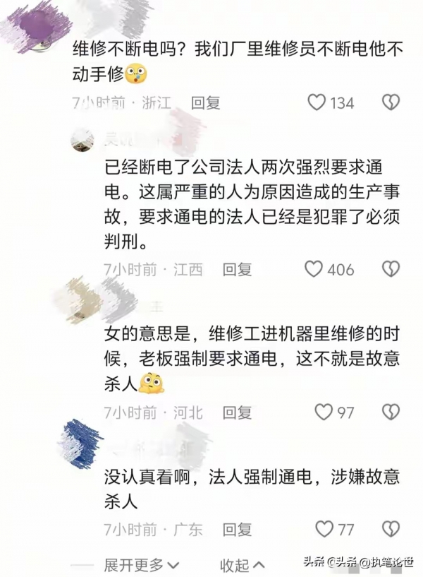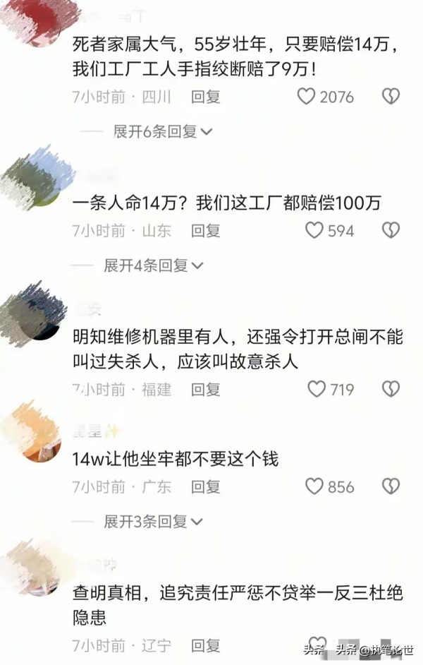 消息曝光后,网友热议纷纷:"这哪里是意外,分明是草菅人命!""14万就想买一条人命?太离谱了,按法定标准,死亡赔偿金、丧葬费、被扶养人生活费加起来至少百万级!"还有网友表示:"工人都知道有危险,负责人却执意合闸,这背后是不是觉得'私了'就能万事大吉?"