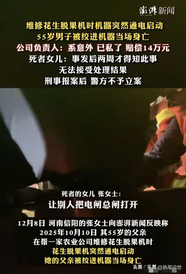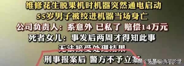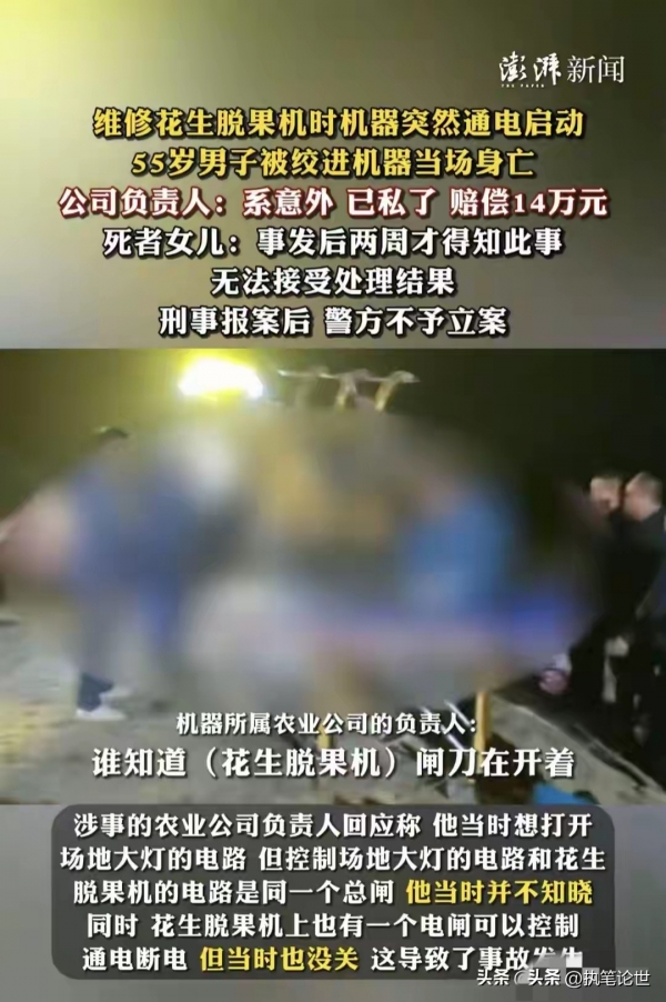 面对家属的质疑,涉事公司负责人给出了解释:当时天色较暗,他只是想打开场地的大灯照明,却不知道场地大灯和花生脱果机共用同一个总闸。同时他还辩解,这台脱果机本身配有独立控制电闸,只是维修时没关闭,多重疏忽叠加才酿成惨祸,全程都是"意外"。