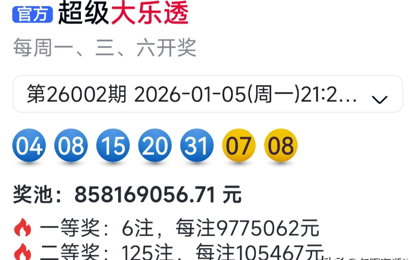 超级大乐透26002期开奖号码为:04 08 15 20 31 + 07 08