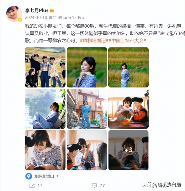 从李七月的日常分享中,就可以明显的看出,她对这份工作非常的满意,相对于严谨且庄重的大舞台,能领略不同地方色彩,畅游在农田中,何尝不是一件心旷神怡的事呢。
