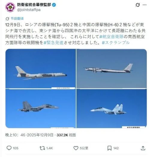 不过"辽宁"号走了,"加贺"号没有窃喜的窗口。12月9日夜间,在中俄第十次联合空中战略巡航中,中俄轰炸机穿越宫古水道后,转向东北,与"辽宁"号汇合。一方面为"辽宁"号提供额外的打击力量后盾,另一方面"辽宁"号的歼-15为中俄轰炸机提供战区空中掩护。