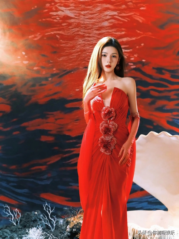 再往前到八月,她那套红玫瑰造型也让人记得特别牢,当时穿了条酒红色丝绒长裙,还是修身的鱼尾款,领口做了深V,边缘还镶了一圈小小的红宝石,发髻上也别了朵半开的红玫瑰,花瓣边微微卷着,带着清晨的露珠,好像刚从花园里摘下来似的。