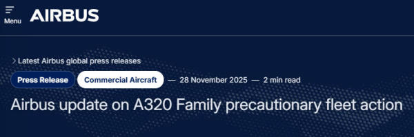 当地时间11月28日,法国空客宣布,立即召回约6000架A320系列喷气式飞机进行维修。