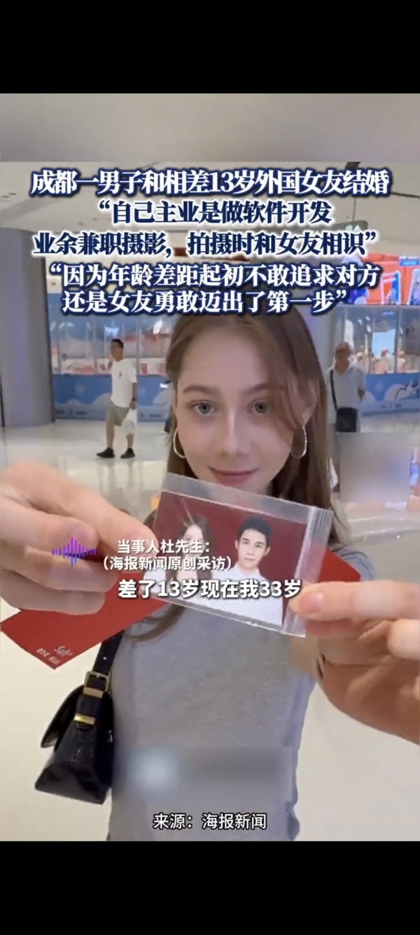 "如果不是她主动牵起我的手,说出'我想和你共度一生',我可能至今还在纠结年龄差距,不敢往前迈步。"33岁的成都小伙阿杰(化名)看着身边20岁的外国妻子莉娜(化名),眼里满是宠溺。这对相差13岁的跨国情侣,在今年八月领证结婚,这段始于花絮拍摄的缘分,不仅跨越了国界与年龄,更藏着一段关于勇敢与真爱的动人故事。