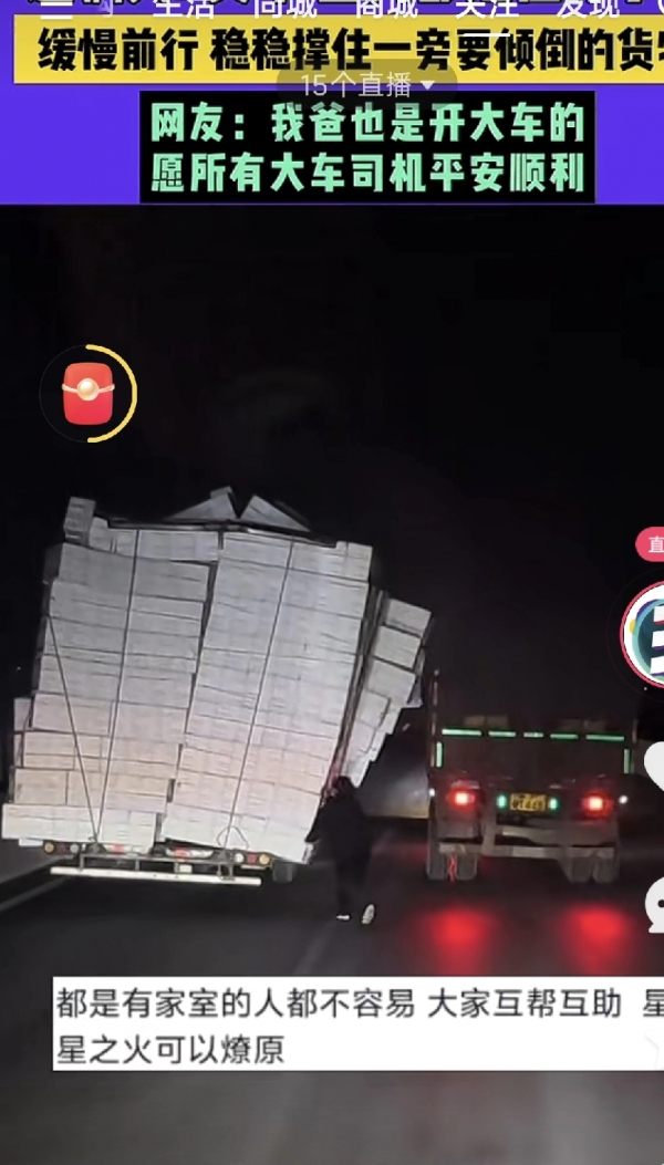 后面的大货车司机,全程没有超车,就这么稳稳跟在旁边,用自己的车身死死撑住倾斜的货物,陪着前车缓慢前行,帮着避险。