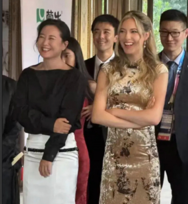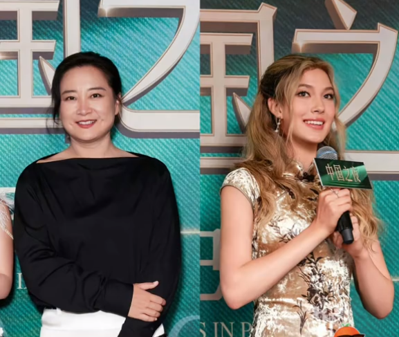 两人一个是一头黑发,一个是黄头发;一个身穿黑色上衣白色紧身长裙,一个穿着金色的中式旗袍。