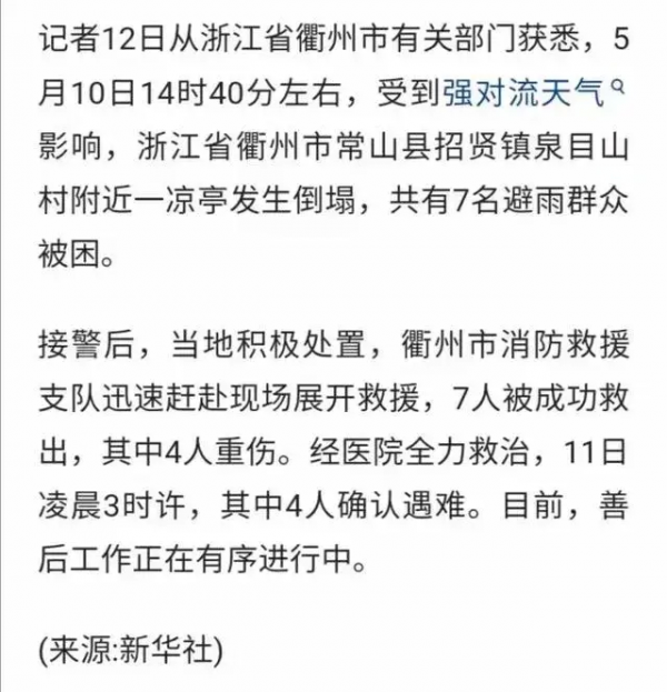 其次,公园凉亭的本身建筑质量问题也在这次坍塌事故中遭到了网友们的质疑。而之前在浙江衢州也发生过没有雷击,在暴雨天气中凉亭发生倒塌的事故。