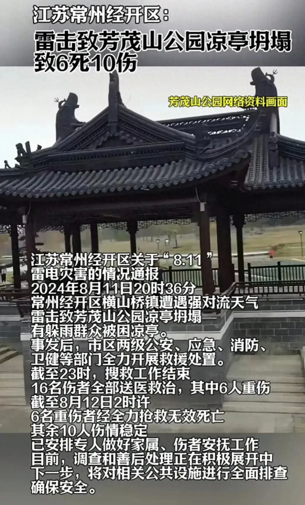 8月11日20点36分,常州经开区芳茂山公园凉亭遭遇雷击后发生坍塌,致使在凉亭内避雨的群众被困。经过多方营救之后,确认6人死亡,10人受伤。