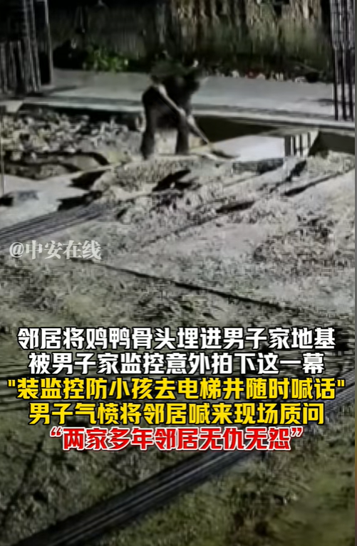 近日,广东一户人家在装修房子,多年的邻居趁着这户人家不在,把鸡鸭的骨头扔到地基里面,这名男子以为自己的举动神不知鬼不觉,殊不知都被监控照出了人性。