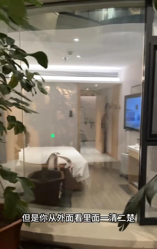 女客随即拿着手机走到客房外面继续拍摄,"但是从外面看里面,一清二楚。为什么会是这样的设计,离大谱了,你们相信吗?"