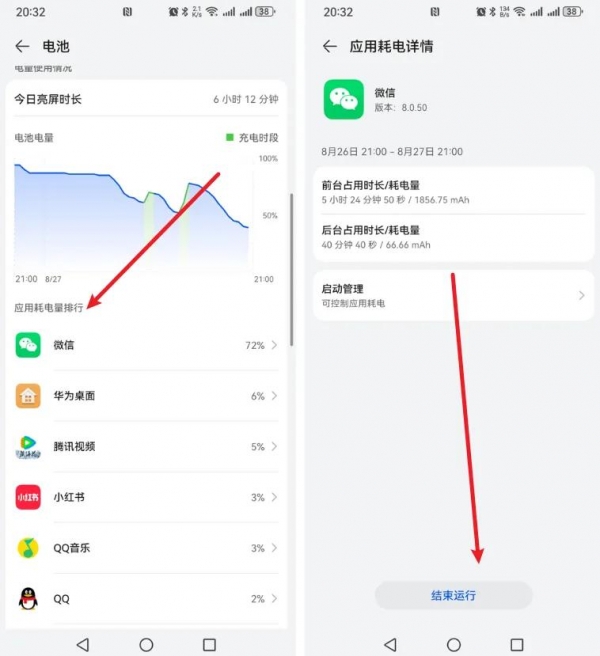2、进入电池界面后我们滑动屏幕到能看到"应用耗电量排名"的位置,就能清晰的看到目前手机耗电应用最高的是哪个和哪些应用,如果想要关闭它,我们点击该应用,进入应用详情后点击底部的【结束运行】即可,如下图所示: