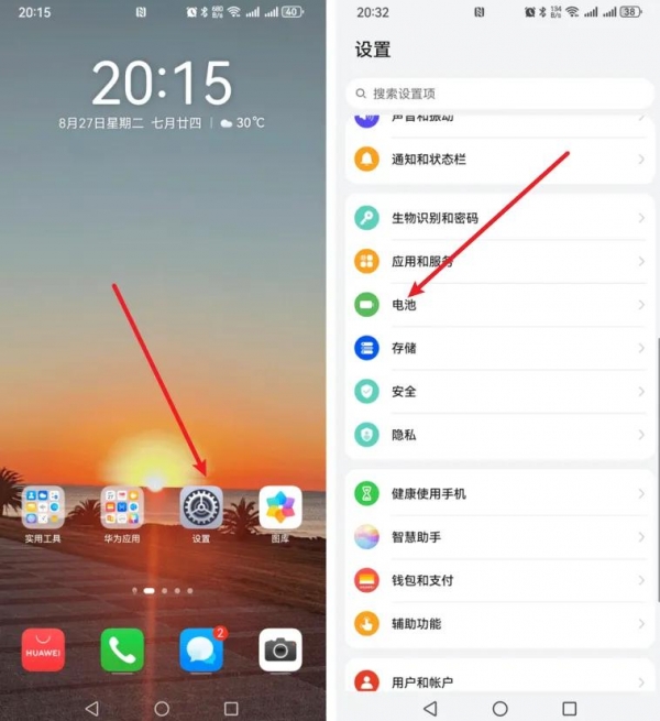 1、在手机桌面中找到并打开我们的【设置】,接着在手机设置中找到并点击【电池】;