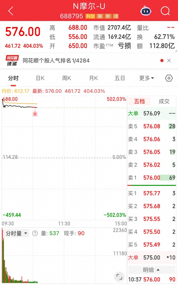 12月5日,摩尔线程正式登陆科创板,开盘价报650元,较114.28元的发行价暴涨468.78%。盘中最高触及688元,涨幅达到502%,市值一度超过2700亿元。按开盘价计算,中一签(500股)的投资者浮盈超过28万元,成为今年以来最赚钱的新股之一。截至发稿,该股最新报576元/股,涨幅为404%。