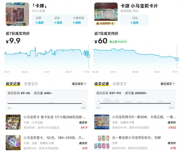 以热门事件中的IP卡牌为例,在某二手交易平台公布的动态行情中,近7日成交均价是60元,较上周下跌11.9元。根据"售价最高"查询,成交额最高的单张约114元,甚至有卖家论斤售卖。可见,在公开可查询、有实际成交额的交易中,都没有出现"天价"卡牌。