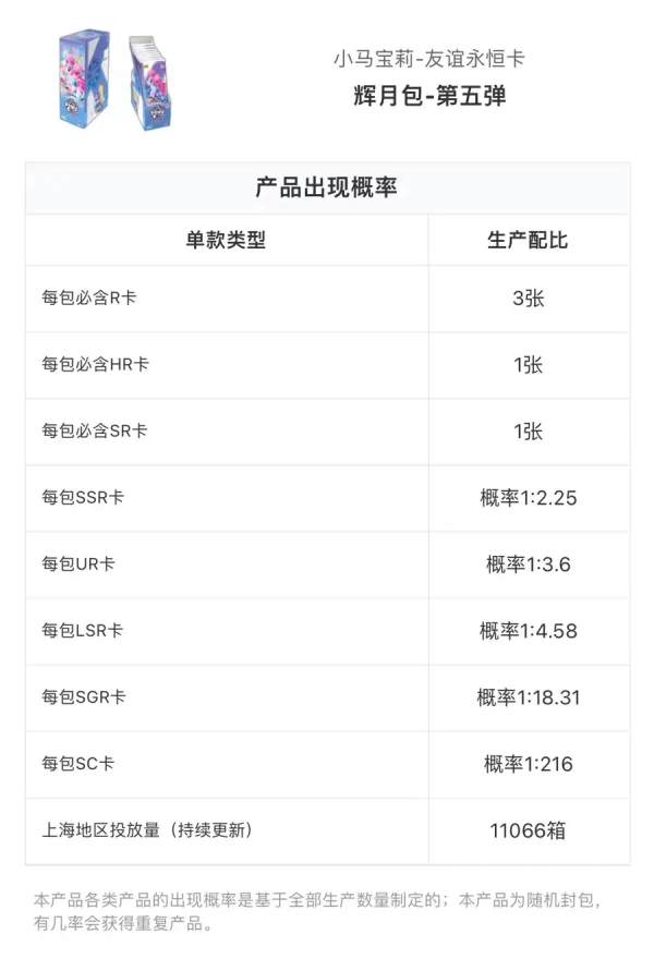 据上海网络辟谣消息,在售的品牌卡牌不论何种IP、规格,包装上均明示了不同种类卡牌的种类和出现概率。以"16万元一张卡牌"所涉及的IP为例,其中"最稀有"的卡牌出现概率为216:1,相关产品在上海地区的投放量超过1万箱,意味着流通中的卡牌量数以百万计。