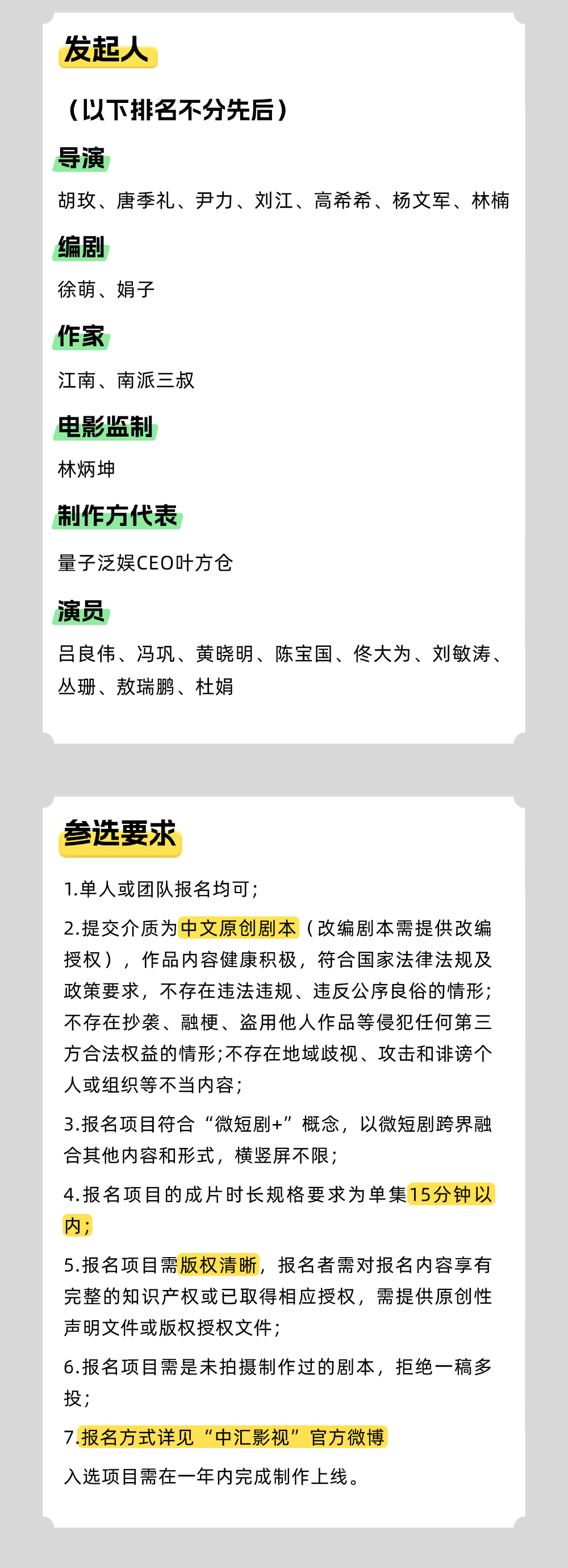 活动将历时4个月,经初审、终审筛选出10个优秀剧本项目,由组委会进行后续备案、制作等全流程指导及扶持,为优秀剧本的孵化和落地提供坚实的保障。活动详细规则及报名方式,详见"中汇影视"官方微博。