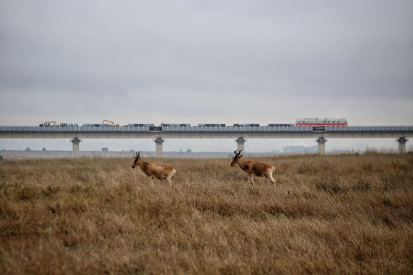 肯尼亚内罗毕,蒙内铁路穿过内罗毕国家公园,采用全高架方式,保证野生动物可以安全穿过铁路。