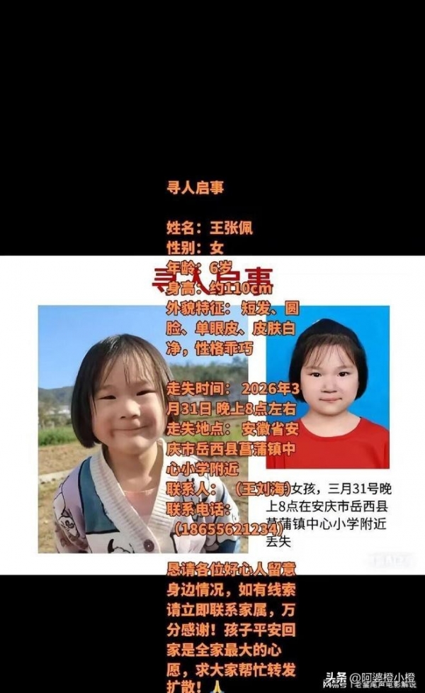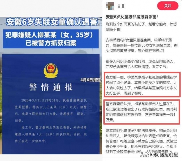 2026年4月6日晚,岳西县公安局发布警情通报,此前失联6天的6岁女童王某佩已确认遇害,犯罪嫌疑人柳某某(女,35岁)被抓获归案。