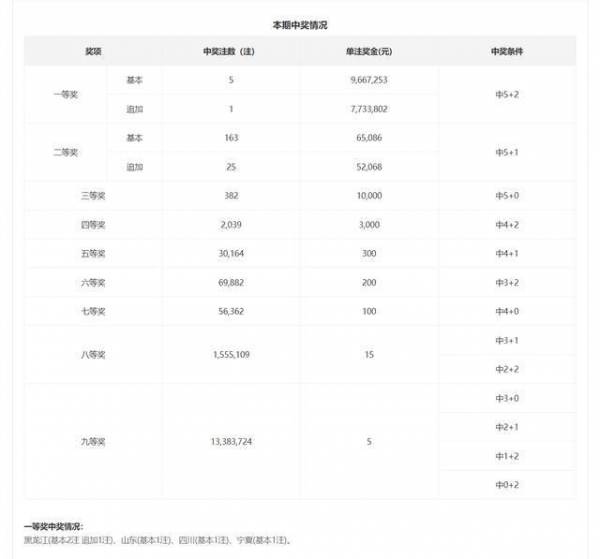 本期全国共开出5注一等奖,单注奖金966万元,其中黑龙江豪揽2注基本奖+1注追加奖(总奖金超2400万),成为本期"双冠王"!山东、四川、宁夏各中1注基本奖,四地彩民喜迎开门红!尽管具体门店尚未公布,但各地彩票圈已沸腾,网友直呼:"黑龙江锦鲤附体,吸欧气!"