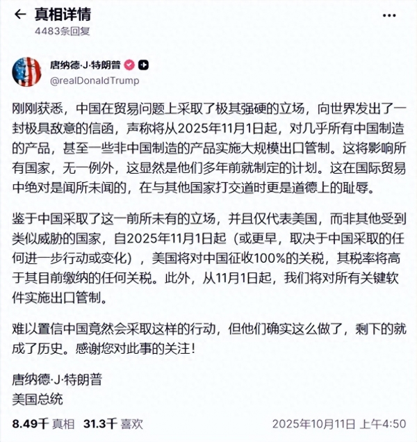 当地时间10月10日,特朗普在社交媒体上连发多条推文指责我国加强稀土出口管控,并宣布从11月1日起对所有中国商品额外征收100%的关税,以及限制对中国出口关键软件。