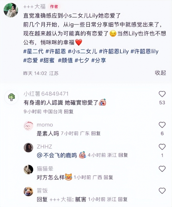 于是很多网友都在这条评论下询问她,Lily的恋爱对象是什么样的男孩,可惜她并未回复。