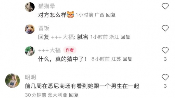 随后,还有IP地址在澳大利亚的网友透露称,前几周在悉尼商场碰到她和一个男生在一起。