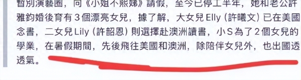但是小S的孩子们还是需要正常的生活与学习的,小S的大女儿许曦文目前在南加大留学,二女儿Lily则去了澳大利亚留学,应该要为了考上澳洲的大学而做准备吧。