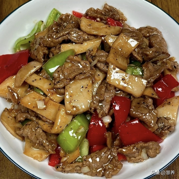 - 牛肉逆着纹理切薄片,加1勺料酒、1勺生抽、半勺老抽、1勺淀粉、少许黑胡椒粉和食用油,抓匀腌制15分钟。