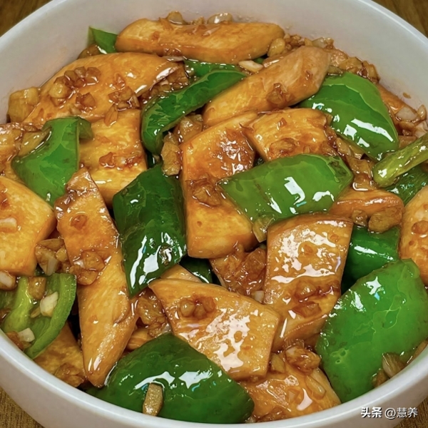 - 锅里留底油,放入蒜末爆香,接着倒入青椒块,快速翻炒至青椒断生。