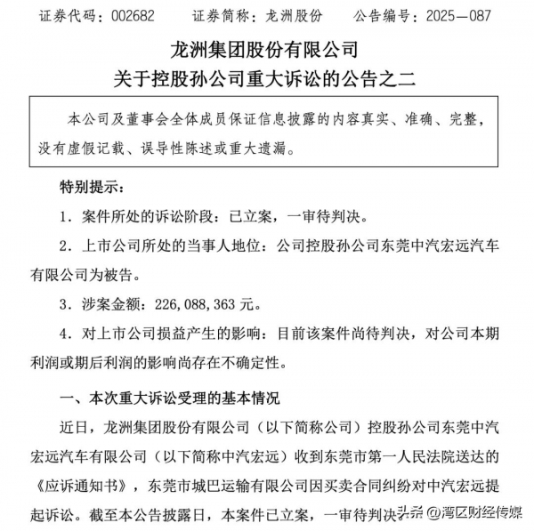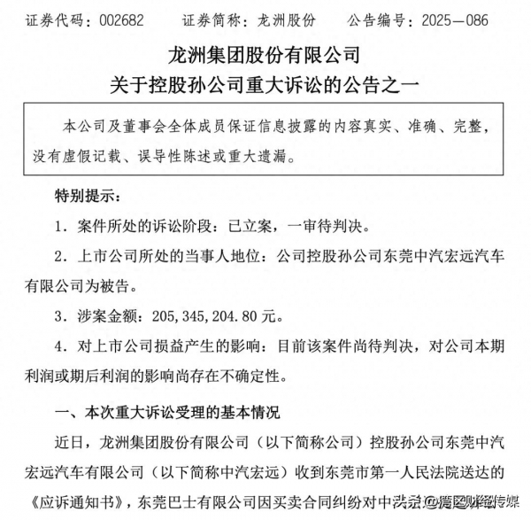 11月25日晚间,龙洲股份(002682)发布两则公告,披露其控股孙公司东莞中汽宏远汽车有限公司(下称"中汽宏远")因买卖合同纠纷涉两起重大诉讼,案件均已由东莞市第一人民法院立案,目前处于一审待判决阶段。