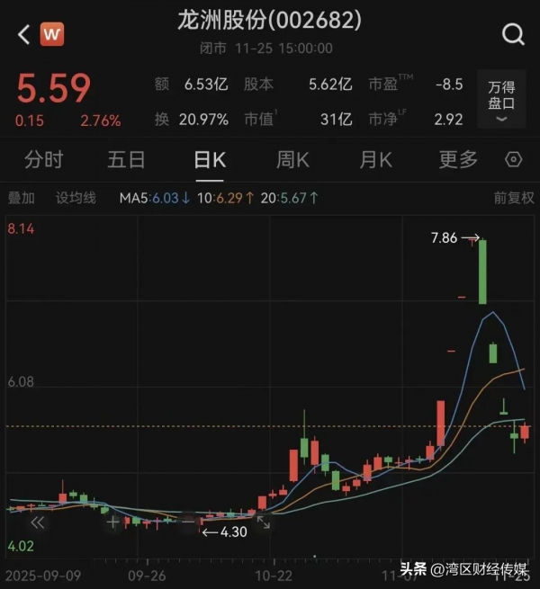 二级市场上,截至11月25日收盘,龙洲股份上涨2.76%,报5.59元/股,总市值约31.44亿元,今年来公司股价累计上涨超32%。