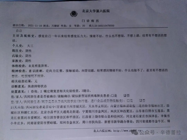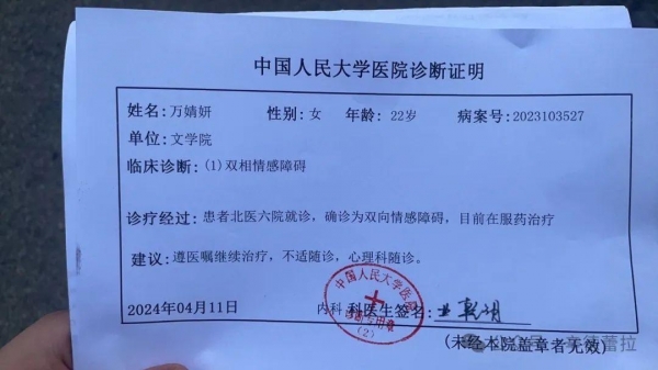 而从诊断证明中可以看到,万婧妍一直在服用药物进行治疗。