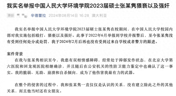 这个名叫万婧妍女生,说自己在校期间,被环境学院2023届的硕士张某强奸。