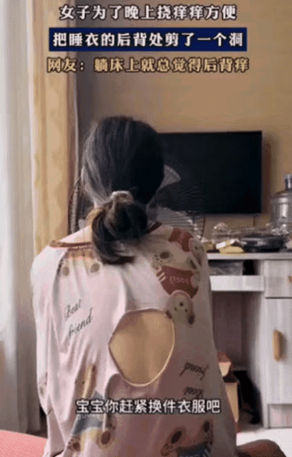 不得不说,现在的年轻人真的是有头脑,为了睡觉的时候挠痒痒方便,特意在背后剪了个洞,关键是,你也不知道在哪块痒啊,如果这也也痒,那里也痒,那东一块西一块的,不得剪好多个洞啊!