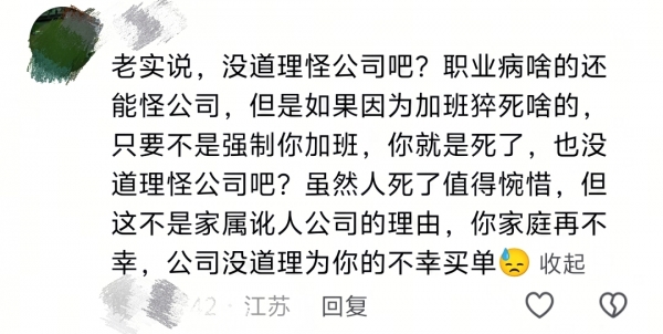 也有人说,出了这样的事情没有理由怪公司,职业病啥的都怪不了公司,但是如果因为加班猝死啥的,只要不是强制你加班,你就是死了,也没道理怪公司吧?虽然人死了值得惋惜,但这不是家属讹人公司的理由,你家庭再不幸,公司没道理为你的不幸买单的。