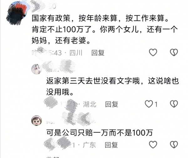 有的也对公司的赔偿方案发表了看法,同情国家有政策,按年龄来算,按工作来算。肯定不止100万了。你两个女儿,还有一个妈妈,还有老婆。但前提是公司只赔一万,而不是100万,现在说啥都没有用,真的没有啥办法。