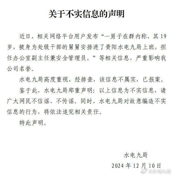 近日,相关网络平台用户发布"一男子在群内称,其19岁,被身为处级干部的舅舅安排进了贵阳水电九局上班,担任办公室副主任兼安全管理员。"等相关信息,严重影响我公司名誉。