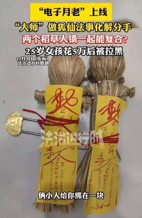 12月9号,一个25岁的姑娘刚和男朋友分手,心里很难过,就在网上找人帮忙,有个自称"电子月老"的人说能用狐仙法事帮她复合,她就信了,按照对方说的买了两个稻草人,还转了五万块钱过去,结果法事做完了,前任没有回来,那个骗子也联系不上,直接把她拉黑了。