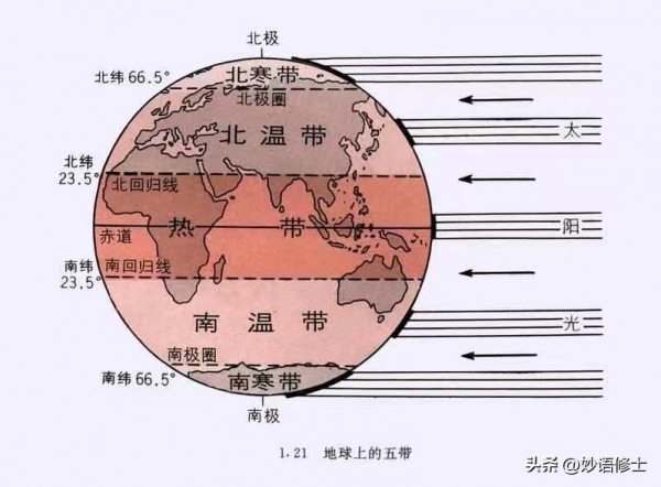 众所周知,咱们地球现在的五个气候带的界限,是南北回归线和南北极圈。南北回归线之间是热带,南北回归线和南北极圈之间是温带,南北极圈和南北极之间是寒带。