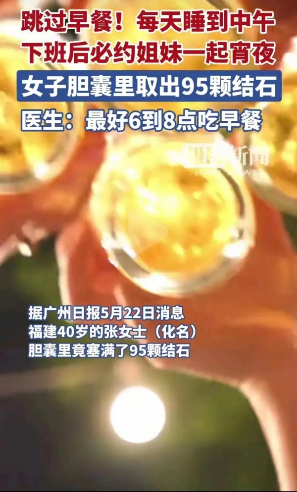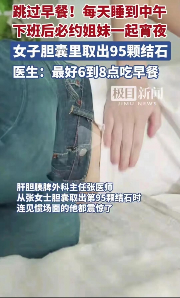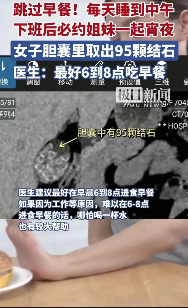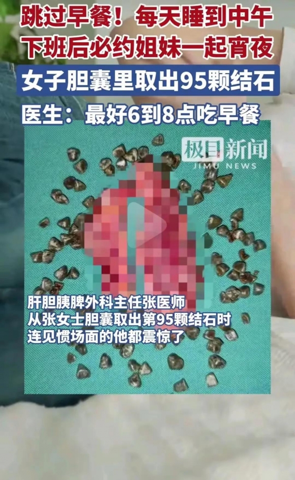 医生解释说,胆囊负责储存胆汁帮助消化。不吃早餐,胆汁就无法正常排出,时间久了容易形成结石;而经常吃油腻的夜宵,更会加重胆囊负担。