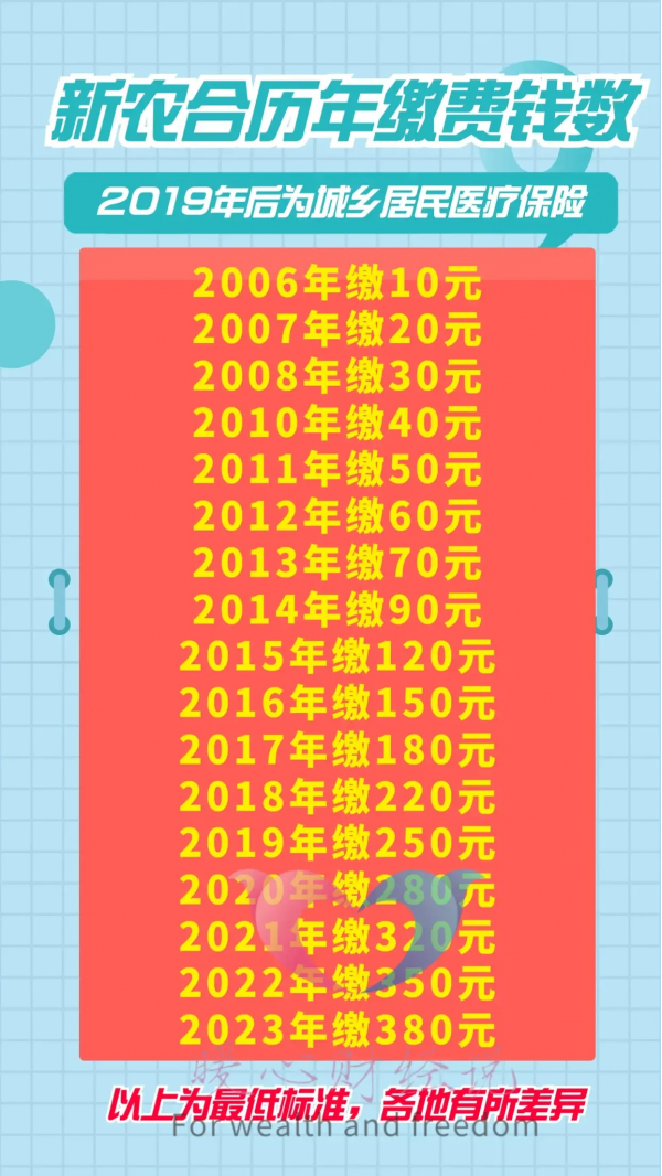 新农合的历年缴费标准确实是在不断上涨的。最初的时候只有10元/年,2014年以后,基本上每年都会增长30~40元。2023年,我国居民医保个人缴费部分提升至380元,比2022年又增加了30元。