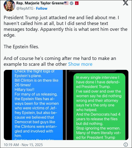 "他之所以这么猛烈地攻击我,当然是拿我杀鸡儆猴,在下周投票决定是否公开爱泼斯坦文件之前,吓唬其他所有共和党人。"